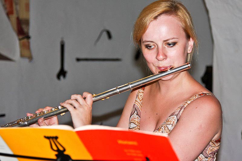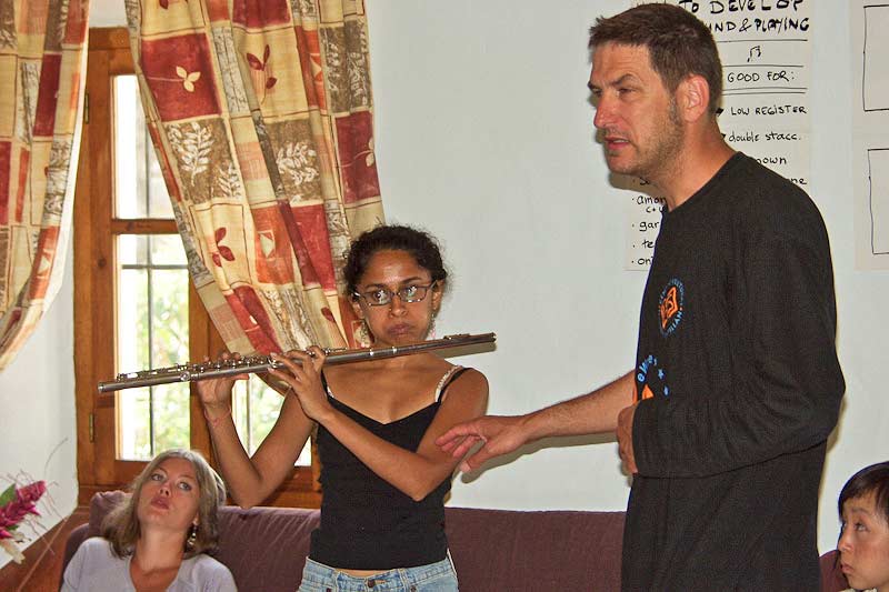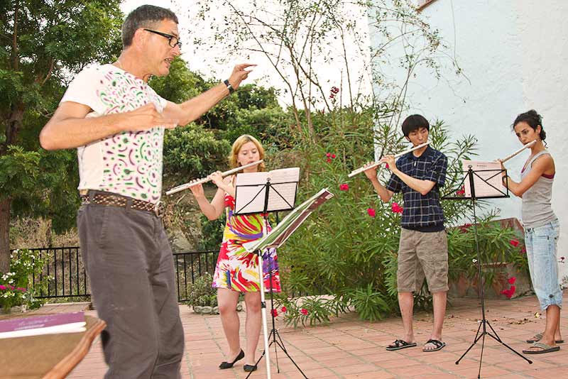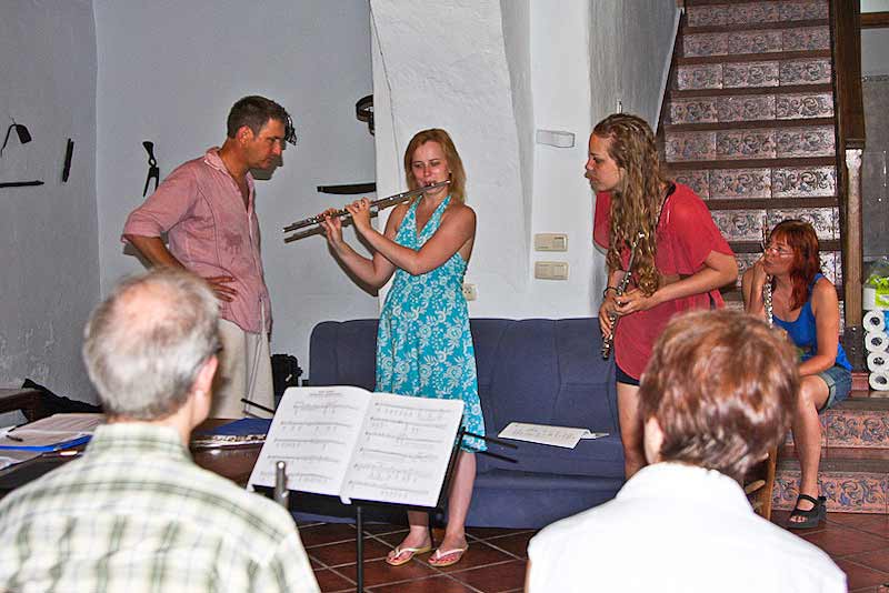 Im Gegensatz zu “normalen” Meisterkursen bestand dieser hauptsächlich aus Gruppenstunden, in denen Offermans seine Ansichten und Übetechniken für erweiterte Techniken vorstellte und diese gemeinsam mit den Teilnehmern erarbeitete. Von Übungen zum Erlernen der Zirkulationsatmung, Haltungsweisen, bis hin zu Übungen für das Spiel von Multiphonics und Whistletones, es war alles dabei, sodass am Ende der Woche keine Frage mehr offen blieb. In den Einzelstunden hatte ergänzend dazu jeder Teilnehmer die Möglichkeit, eine der Techniken zu verfeinern, sich Tipps für das Spiel auf der Bass- oder Kontrabassflöte zu Holen oder an einer der Etüden zu arbeiten.
